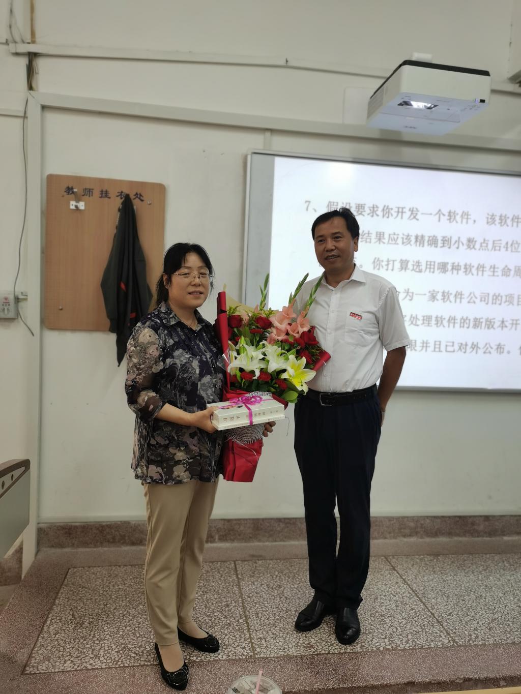 陈春林在课间休息时间来到教室,为罗晓霞教授送上鲜花和节日问候,并向其赠送《习近平谈治国理政》(第3卷)。对她在教学科研一线辛勤耕耘、努力付出表示衷心的感谢。罗晓霞衷心感谢学校的关怀和支持,表示将努力工作,开拓创新,为学校发展贡献自己的力量。