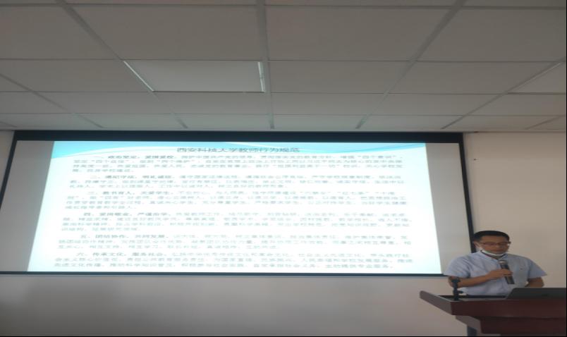 党委副书记陈伟伯领学习近平总书记在教育大会、清华大学考察时对加强教师队伍建设要求和对广大教师的希望;副院长于振华领学“西安科技大学教师行为规范”;副院长马天带领全体教师庄严宣誓。罗晓霞、张小艳、许晓阳、马天、邓凡、白生宝6名教师结合自身成长经历和教学、科研、管理服务经验谈认识体会。