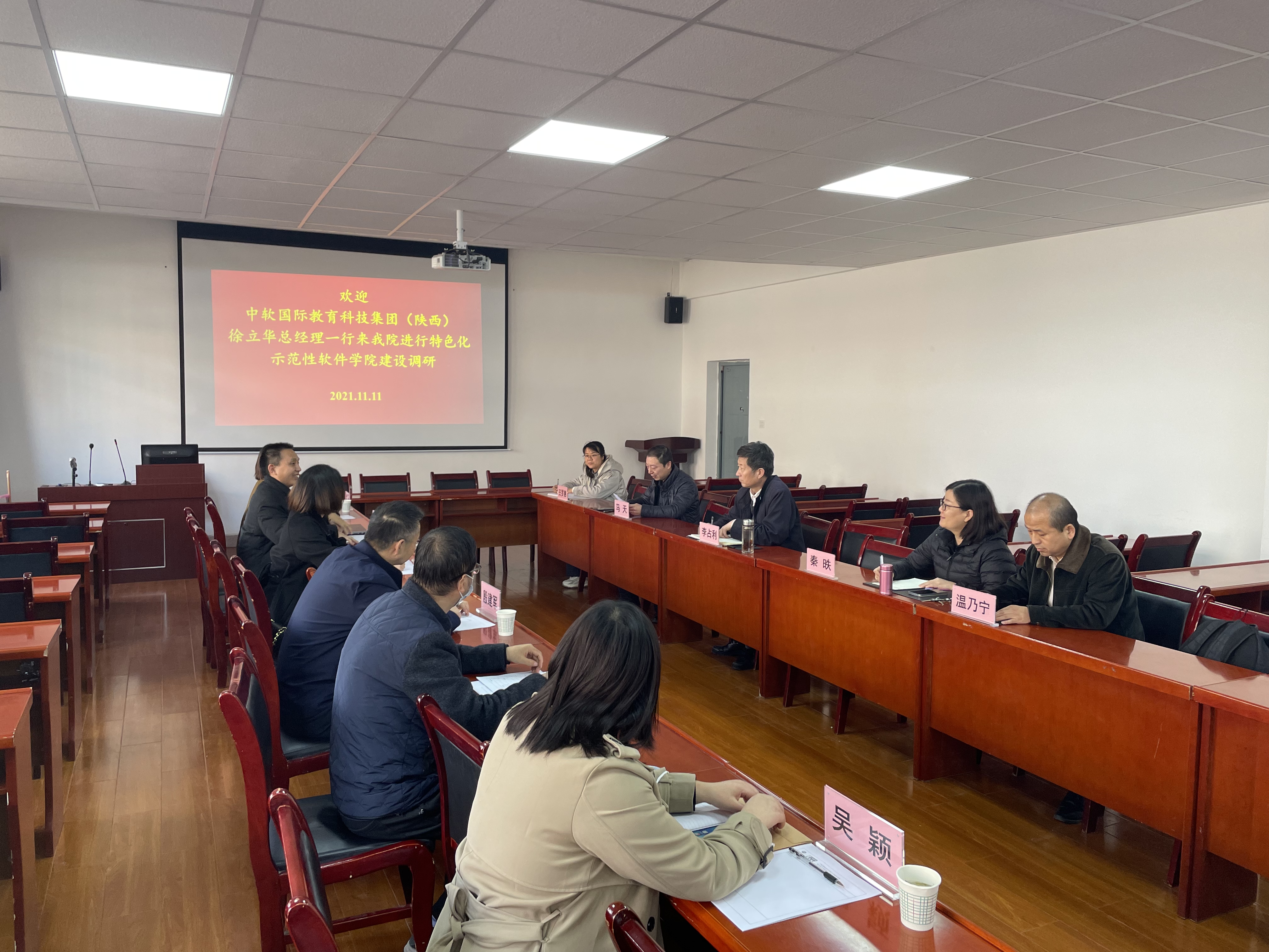 2021年11月11日下午中软国际教育科技集团(陕西)总经理徐立华带队,专家方长青、执行校长殷建军、校企总监王楠、解决方案总监刘枫、校企经理吴颖等一行,来星空体育中国官方网站进行特色化示范性软件学院建设调研。
