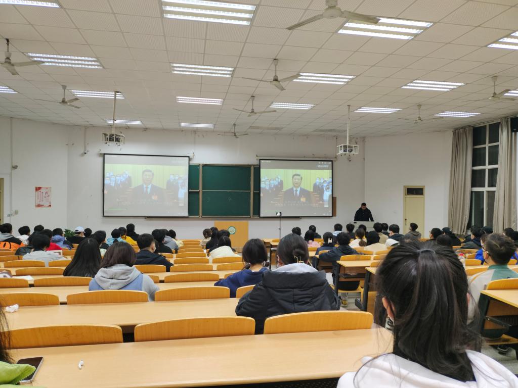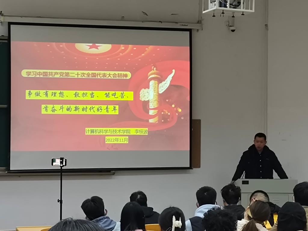 11月21日晚,计算机学院在临潼校区骊山校园9教101进行了第57期初党的第一次党课,学院党委书记李绥波是此次主题为《学习中国共产党第二十次全国代表大会精神,争做有理想、敢担当、能吃苦、肯奋斗的新时代好青年》党课的主讲人。本期入党积极分子培训班学员共102名同学参加学习,还有100余名学生党员在线参加党课接受再教育。