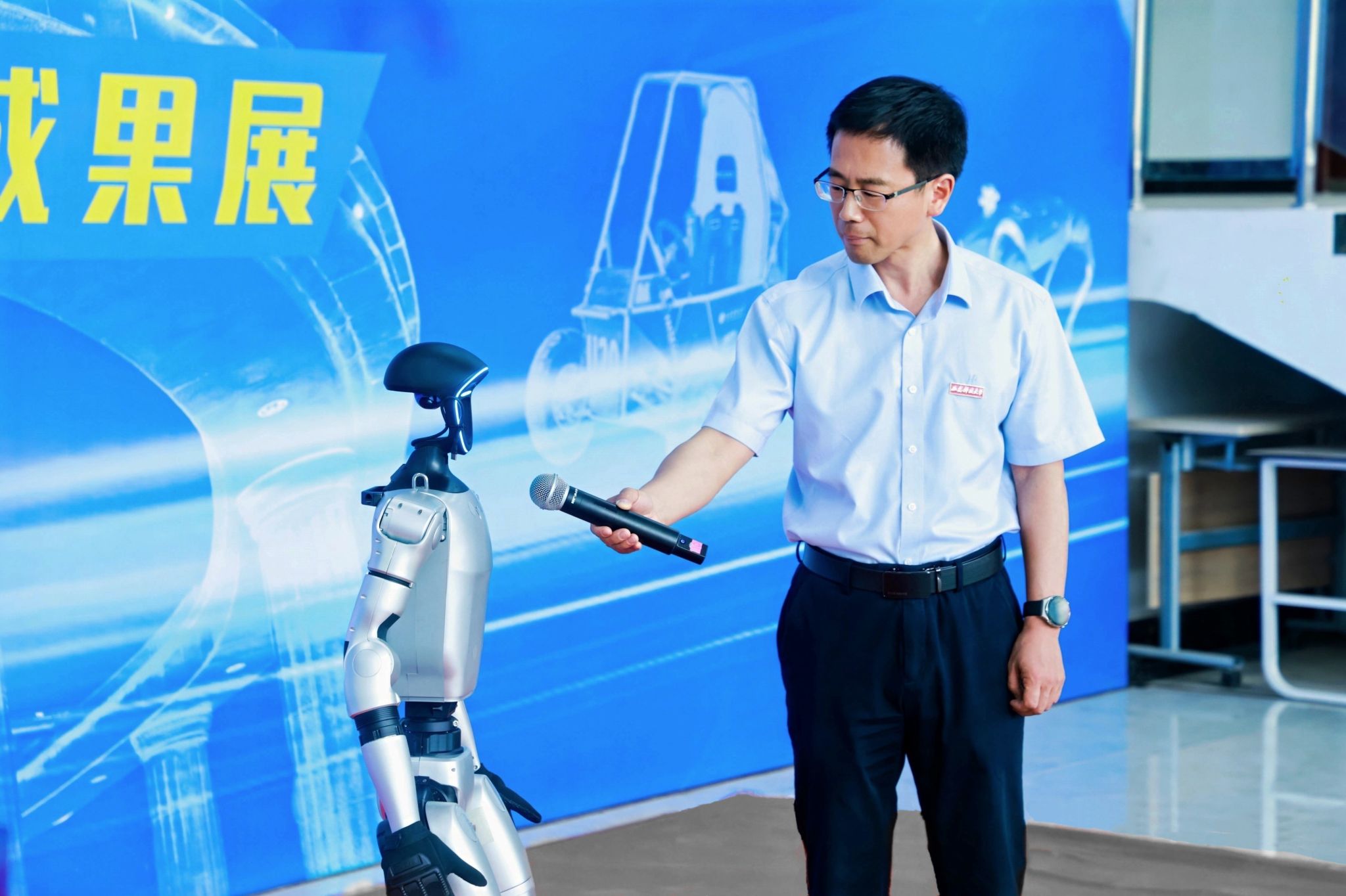 曾亮相体育节和工作会议的“网红”机器狗,此次展示了坐、卧、行走等指令。配备热像仪、激光雷达等传感器,可应用于高危环境智能巡检。侯锐志老师表示:“已实现从感知到认知的跃迁,为安全巡检提供创新解决方案。”