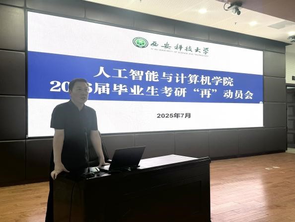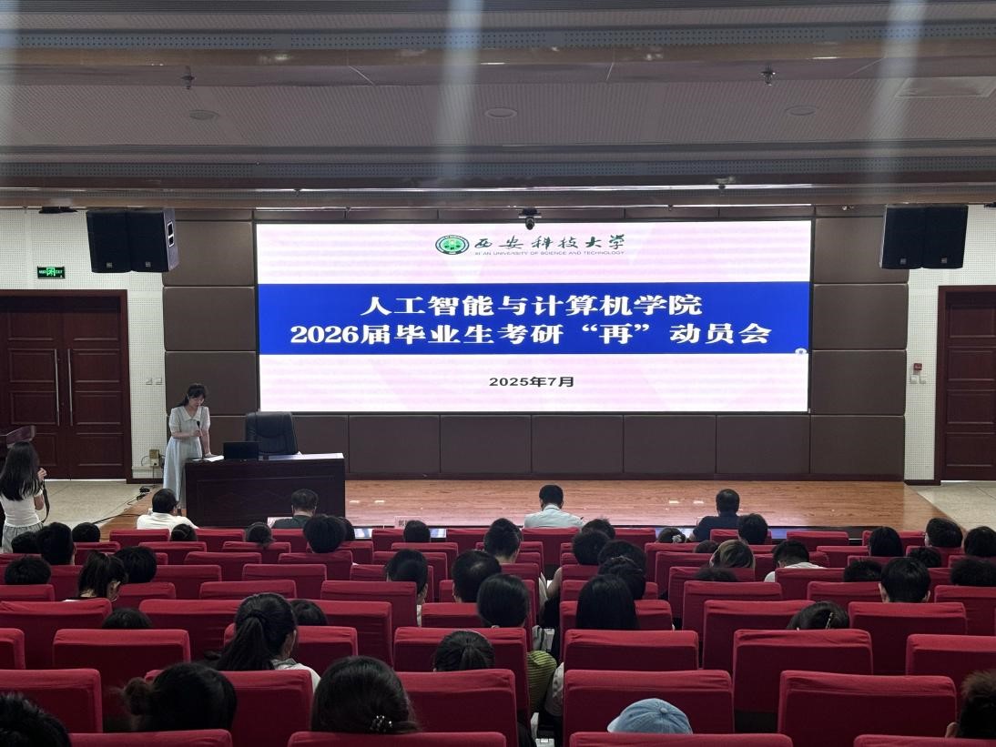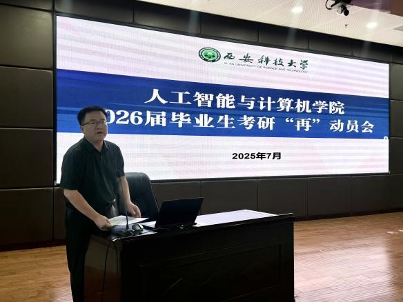 为做好2026届毕业生考研指导服务工作,帮助学生明确备考目标、增强考研信心,进一步激发考研热情,7月7日,人工智能学院在临潼校区骊山校园煤炭科技楼二楼报告厅举行2026届毕业生考研“再”动员会。学院党委书记李绥波,副院长马天、金浩、辅导员代表、2022级全体考研学生参加会议。会议由学院党委副书记郭胜忠主持。