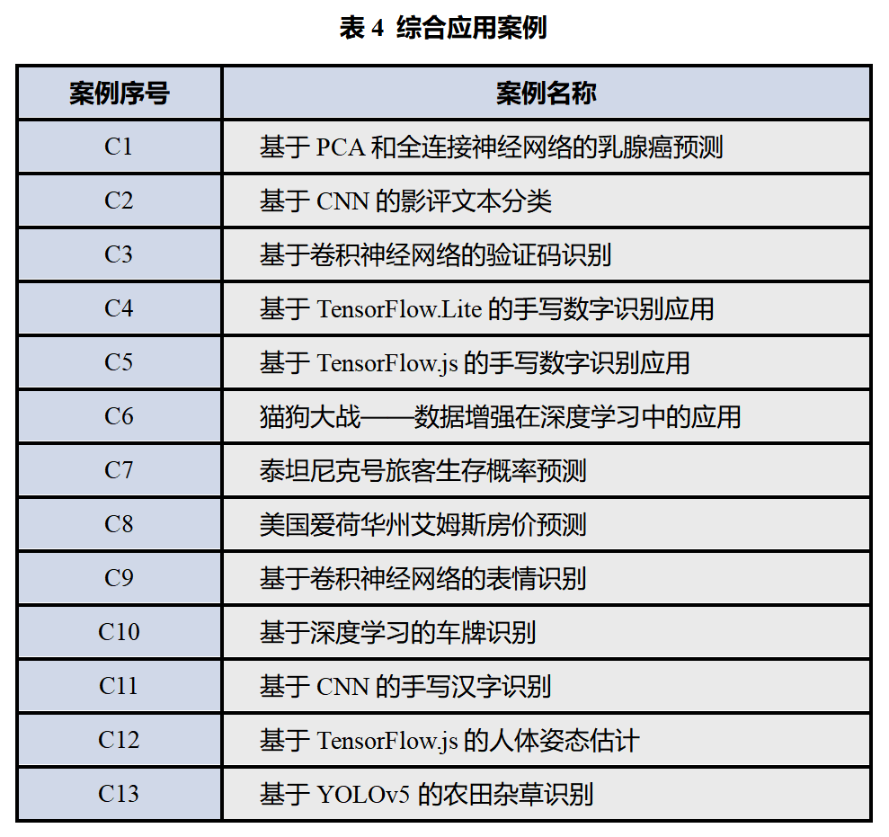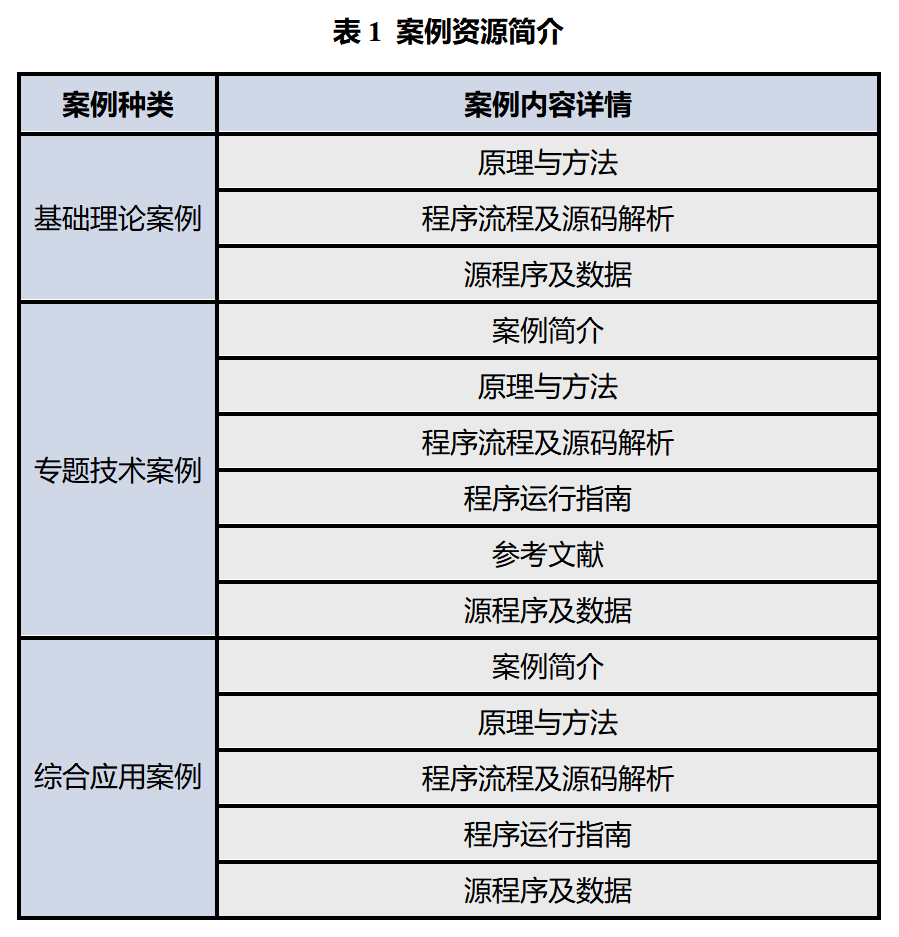 使用案例库展开教学,有利于将理论与实践应用相结合,引导学生从主动获取专业知识、发现问题、分析和解决问题,培养运用理论和方法解决实际问题的能力,从而提高新工科专业学生的人工智能实践应用能力,培养创新能力,充分发挥学生主观能动性,满足综合能力培养目标达成度要求,达到技能与知识、方法与过程的统一,对于切实提升工程教育人才培养质量具有广泛的应用前景价值和重要的现实意义,本案例中所包含的资源简介如表1所示: