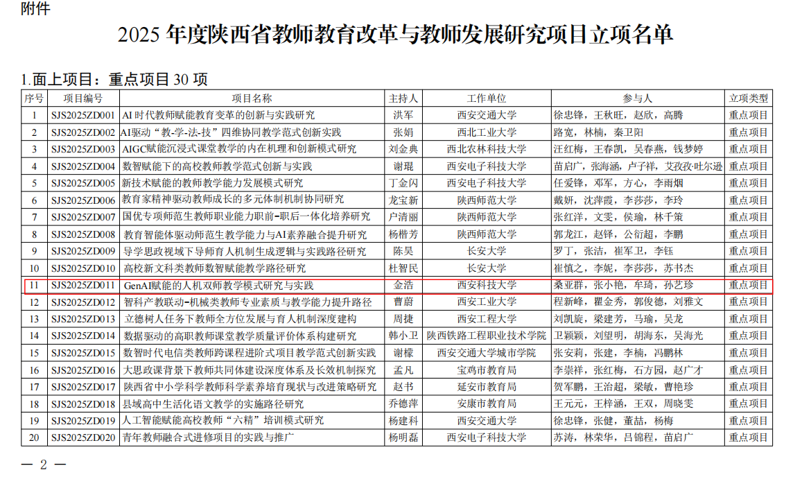近日,陕西省教育厅公布了2025年度陕西省教师教育与教师发展研究项目评审结果。星空体育中国官方网站金浩教授主持申报的《GenAI赋能的人机双师教学模式研究与实践》获批重点项目立项。