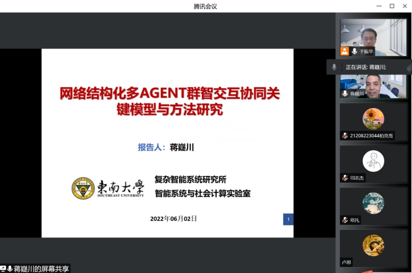 2022年6月2日上午9:00,东南大学蒋嶷川教授为计算机学院师生做题为“网络结构化多Agent群智交互协同关键模型与方法研究”的学术报告。报告由计算机学院于振华教授主持,学院七十余名师生在线聆听了报告。