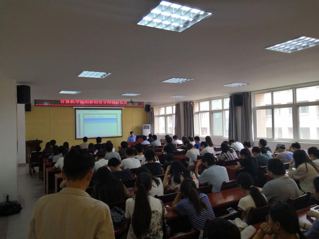 首先,李占利代表学院对受邀担任计算机学院大学生创新创业导师的杨军、闫永军颁发了聘书。然后,杨军作了《国家战略与个人发展》的报告,闫永军作了《新经济形式下大学生创新创业探讨》的报告。最后,导师们分别对大学生们提出的相关问题一一作了解答。