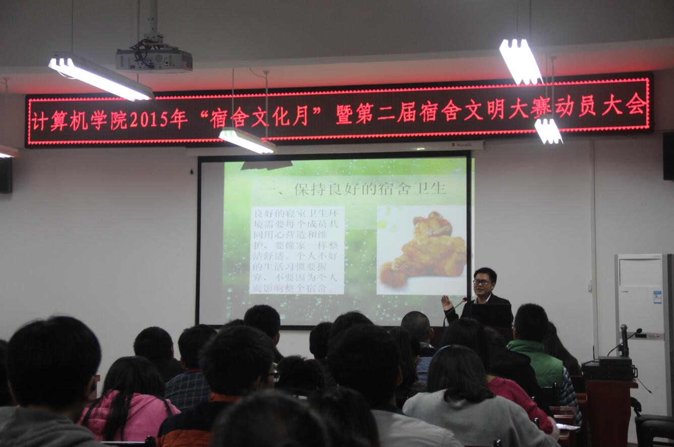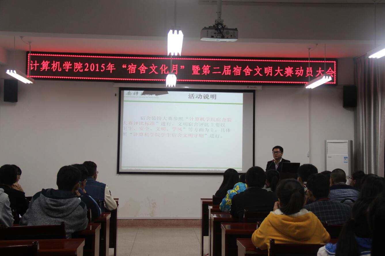 12月17日晚,计算机学院第二届“宿舍文化月”活动表彰大会在16教5楼举行。计算机学院相关辅导员及各班生活委员、各宿舍长以及院学生会生活部同学100余人参加了此次活动。会上对对计算机学院14511等22个装扮优秀宿舍、5503等19个文明宿舍和王光磊等20名先进个人予以表彰。